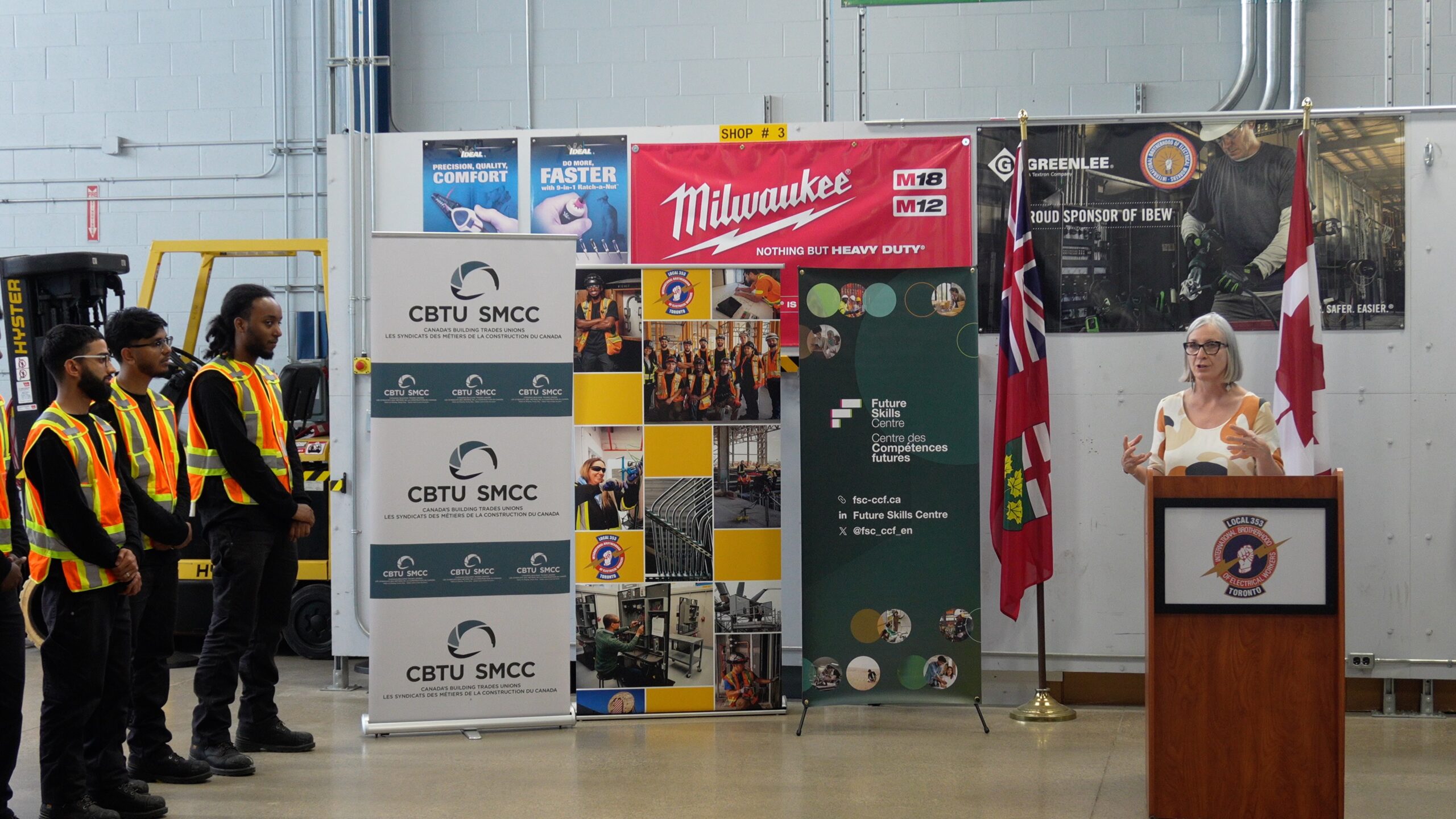 On June 24, IBEW Canada proudly joined national partners and government leaders at IBEW Local 353’s training centre in Mississauga, ON, for a media event hosted by the Future Skills Centre (FSC), Skillplan, and Canada’s Building Trades Unions (CBTU).